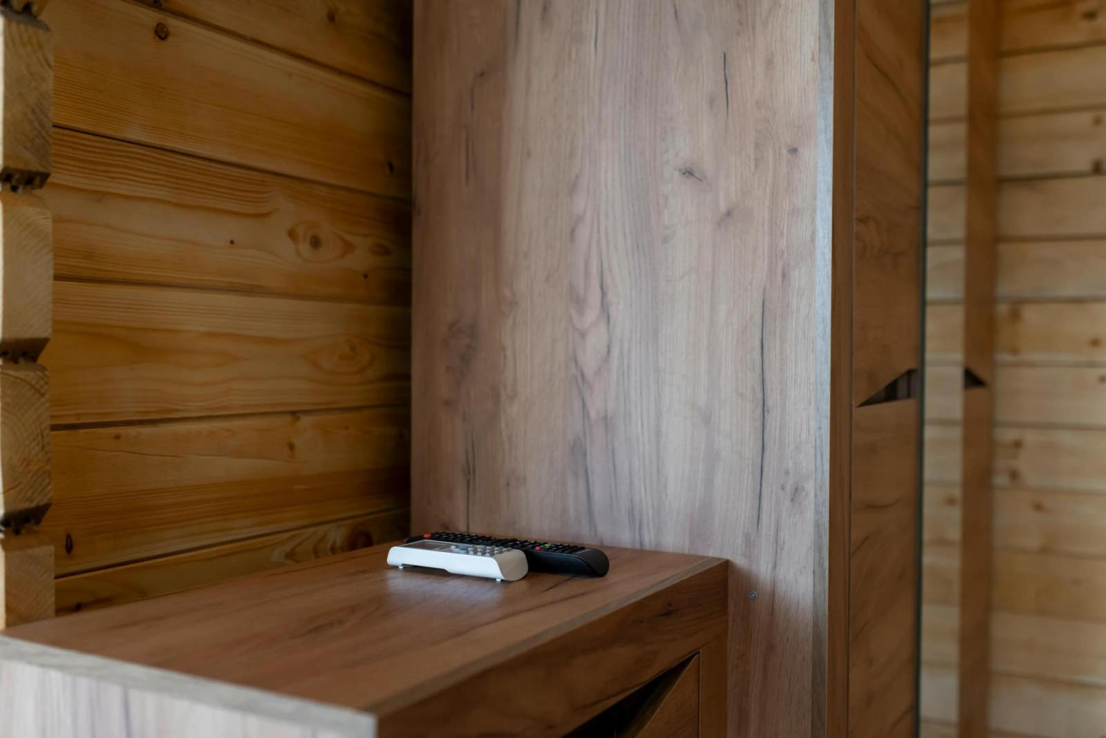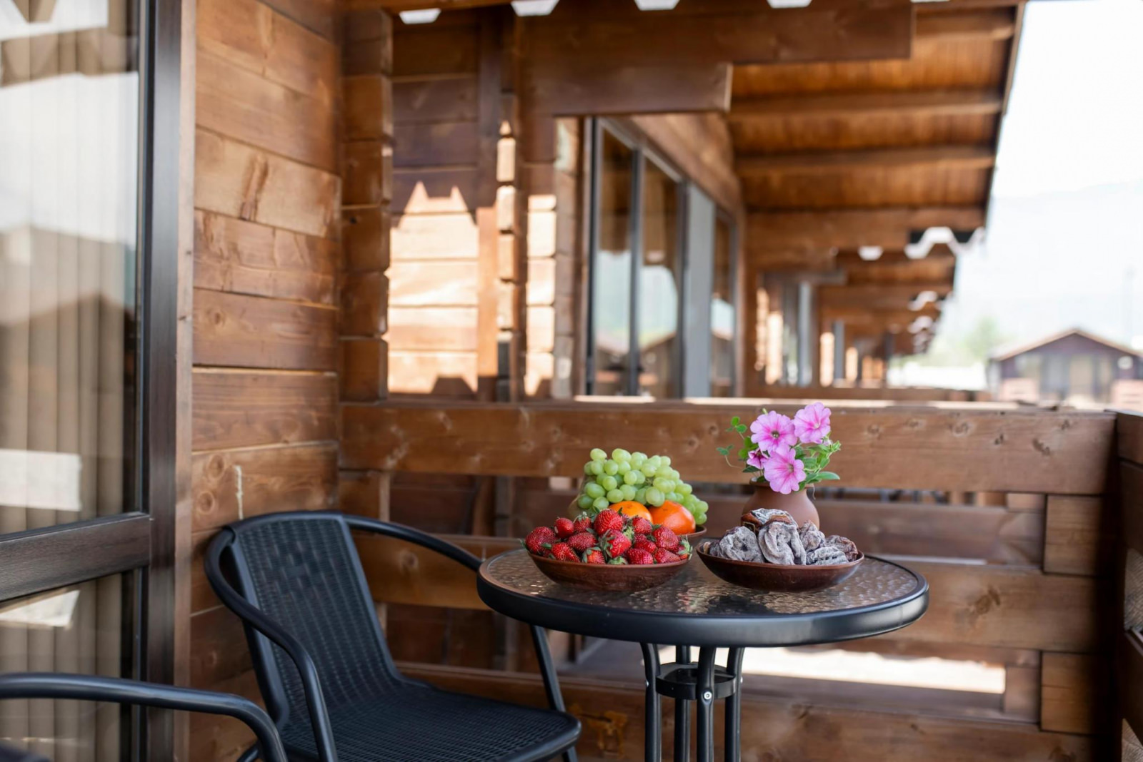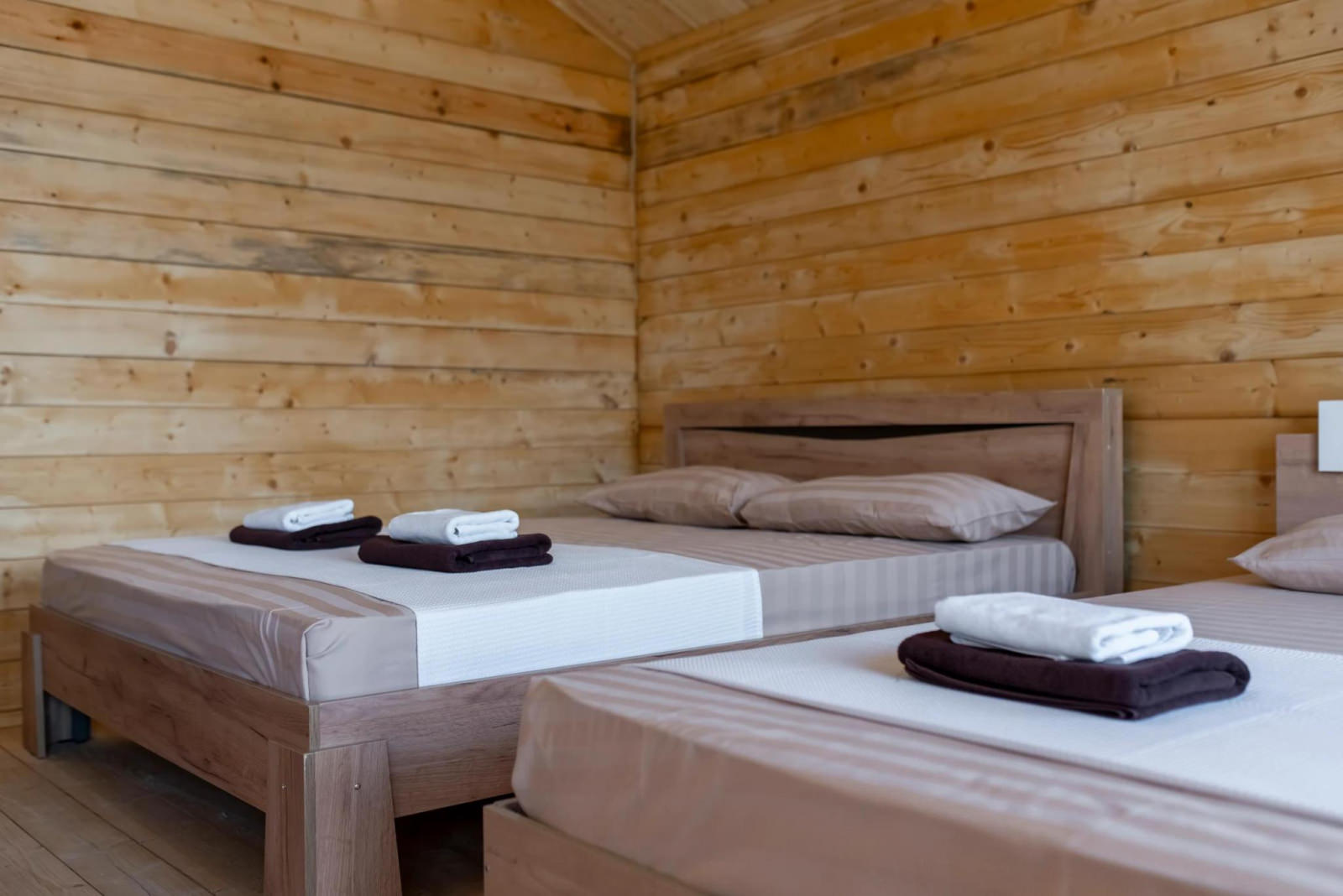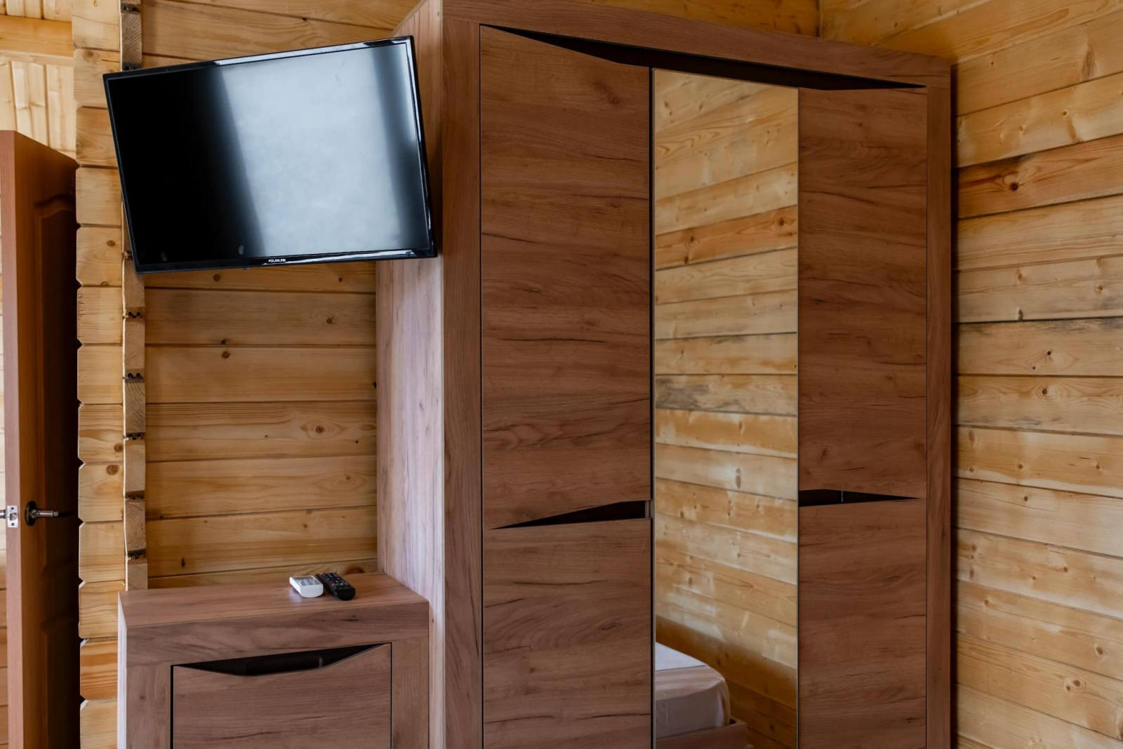 В номере двуспальная и одна односпальная кровать, стол, стулья, шкаф, прикроватные тумбочки, комод, вешалка, зеркало, сплит-система, холодильник, спутниковое ТВ, интернет, чайник, посуда, фен, уличная мебель.
